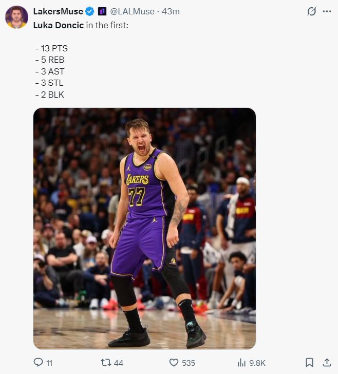 里夫斯、詹姆斯继续伤停,卢卡-东契奇复出带队,上一场湖人平民阵容击败了开拓者,东契奇此役复出带队面对状态不俗的马刺。首节东契奇就展现了超级魔术师的风采,首节拿到13分5篮板3助攻3抢断2盖帽,东契奇积极性太强。